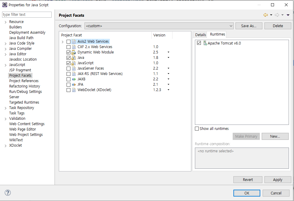 3. Project Facets -> Java -> Apache Tomcat (버전) 체크
