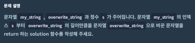 - 예제 2번의 my_string 에서 인덱스 7부터 overwrite_string 의 길이만큼에 해당하는 부분은 "29b8UYP"이고 이를 "merS123"로 바꾼 "ProgrammerS123"를 return 합니다.
